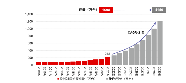 作为热泵普及率最高的欧洲地区,根据欧洲热泵协会预测,到2026年需要新增安装2000万台,到2030年需要新增6000万台热泵,对应10年CAGR约为21%。