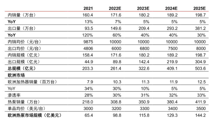 总而言之,在碳中和背景下,热泵作为关键解决技术方案,其长期成长的确定性是可见的。根据中信证券测算,到2025年,国内热泵市场规模达到500亿元;欧洲热泵市场规模达到144亿美元。