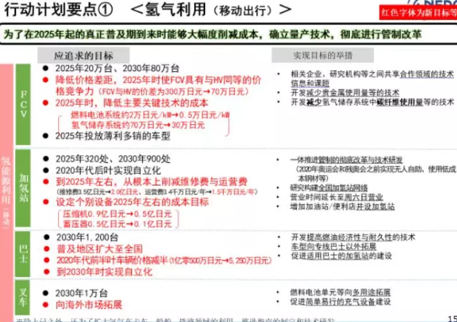 交通方面,政府制定目标大幅度削减成本,确立量产技术。日本的氢能发展战略中对氢能汽车、加氢站、公交车、工厂搬运叉车等方面都设立了具体的发展目标。如在2030年前建成900座加氢站,推广氢能汽车80万辆,公交车1200台,、工厂叉车1万台台。
