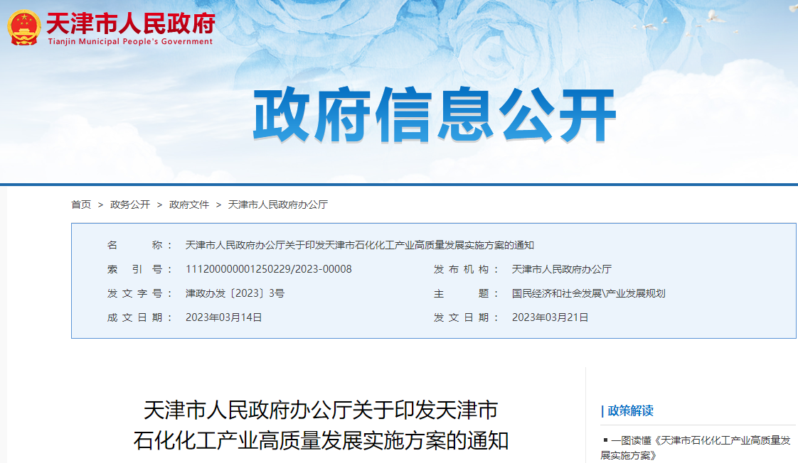 3月21日,天津市人民政府发布《天津市石化化工产业高质量发展实施方案》全文。文件提出,冷能、风电、光伏发电等绿色能源占比力争达到10%以上,工业副产品氢气回收利用率达到95%以上。