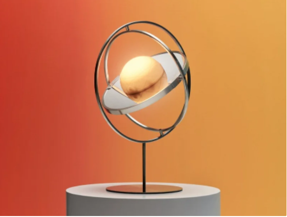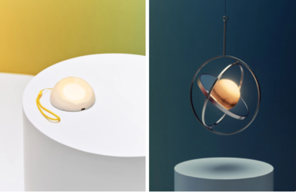 两款 LED 灯新品分别用于桌面和天花板,从外形来看旨在模仿太阳和地球的轨道。这盏灯有一个 23.5 度角的半球形中心光源,被固定在镜面上,周围环绕着金属环。该灯有带底座的台灯或吸顶式吊灯型号。