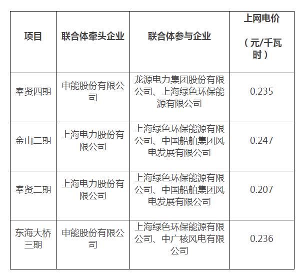 奉贤四期业主为申能股份有限公司联合体,上网电价为0.235元/千瓦时;金山二期业主为上海电力股份有限公司联合体,上网电价为0.247元/千瓦时;奉贤二期业主为上海电力股份有限公司联合体,上网电价为0.207元/千瓦时;东海大桥三期业主为申能股份有限公司联合体,上网电价为0.236元/千瓦时。