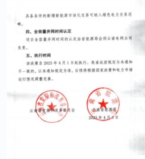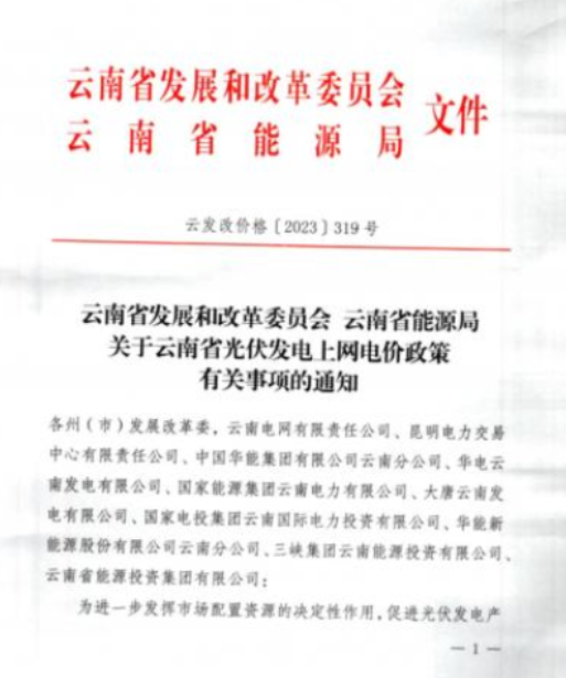 4月3日,云南省发展和改革委员会、云南省能源局发布了《关于云南省光伏发电上网电价政策有关事项的通知》。该政策自2023年4月1日起执行。通知显示,为进一步发挥市场配置资源的决定性作用,促进光伏发电产业健康有序发展,提升能源保供能力,云南省对新增合规光伏发电项目全电量纳入市场统筹。
