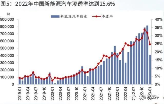 在政策与需求的持续刺激下,全球新能源汽车市场渗透率屡创新高。作为全球第一大电动车市场,中汽协数据显示,2022 年中国新能源汽车销量为 688.7 万辆,同比增长 93.4%,渗透率达到 25.6%,高于上年 12.1pcts。2023年1-2月,中国新能源汽车销量达93.3万辆,持续爆发式增长。