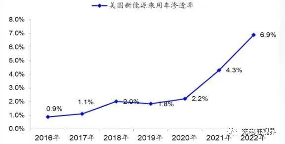 美国新能源汽车的增长更为迅猛。数据显示,2022年美国新能源乘用车销量98.6万辆,同比增长49.2%,渗透率达6.9%。2023年1月、2月,美国新能源乘用车销量分别达到 10.3万辆和11万辆,同比分别增长66.1%和62.4%,单月渗透率创历史新高,2月单月渗透率已达9.5%。