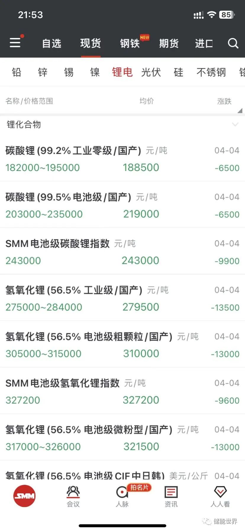 步入今年后,电动车电池核心原材料电池级碳酸锂价格持续下跌,4月3日,据上海钢联发布数据,电池级碳酸锂跌12500元/吨,均价报23.25万元/吨;