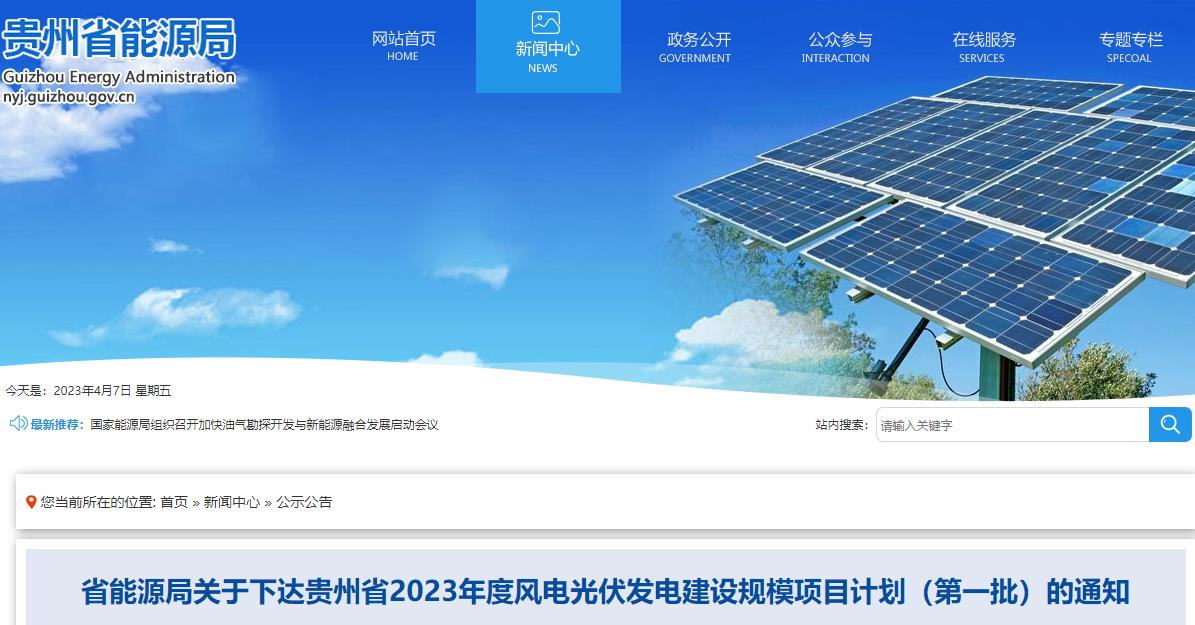 4月6日,贵州省能源局发布《省能源局关于下达贵州省2023年度风电光伏发电建设规模项目计划(第一批)的通知》。
