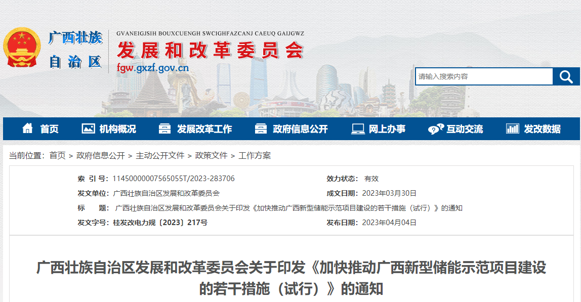 2023年4月,广西发改委发布《加快推动广西新型储能示范项目建设的若干措施(试行)》。文件明确示范项目作为独立储能的市场主体地位参与电力市场。并提出以下内容: