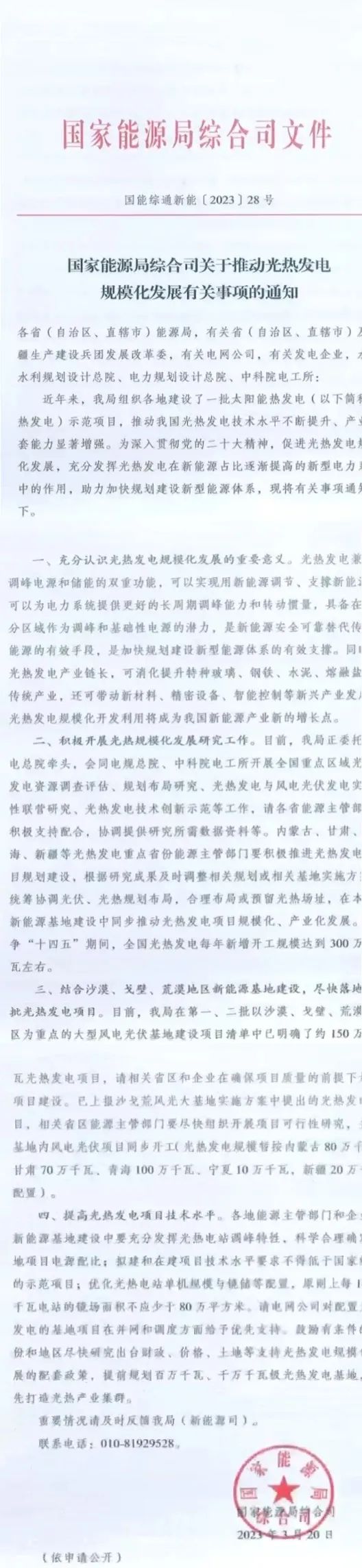 近日,国家能源局发布《国家能源局综合司关于推动光热发电规模化发展有关事项的通知》要求:积极开展光热规模化发展研究工作,内蒙古、甘肃、青海、新疆等光热发电重点省份能源主管部门要积极推进光热发电项目规划建设,根据研究成果及时调整相关规划或相关基地实施方案,统筹协调光伏、光热规划布局,合理布局或预留光热场址,在本省新能源基地建设中同步推动光热发电项目规模化、产业化发展,力争“十四五“期间,全国光热发电每年新增开工规模达到300万千瓦左右。