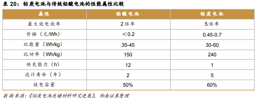 设备寿命长。铅炭电池在铅酸电池的负极中添加特制的导电性多孔炭,解决了负极活性物质颗粒变大的问题,电池的寿命是传统铅酸电池寿命的两倍。