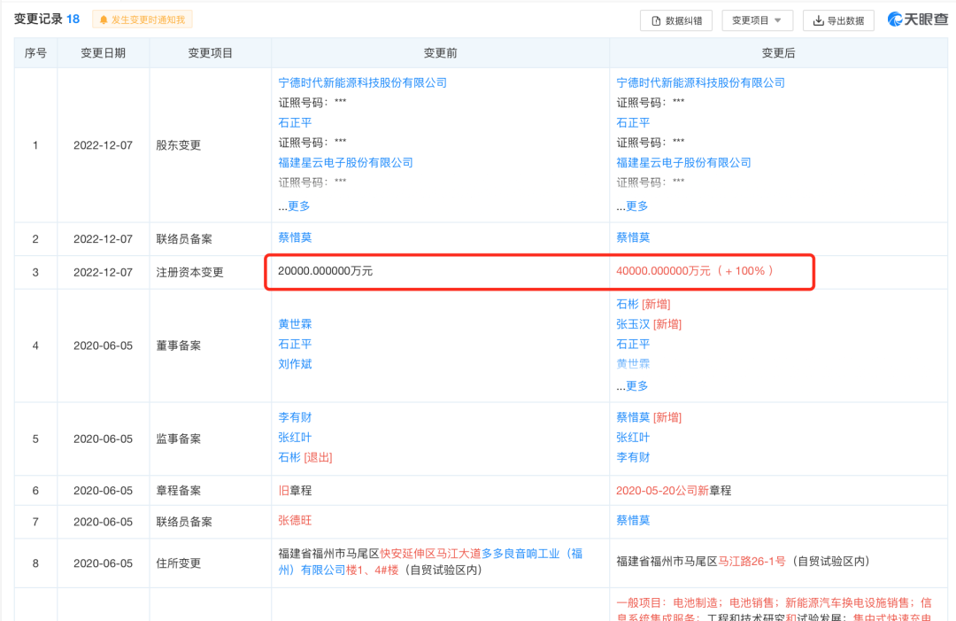时代星云由宁德时代在2019年出资成立,现在不过三年的时间,注册资本已经从2亿元增资到4亿的信息,最新的变更的时间是2022年12月7日。同时,时代星云已经在福建、上海、贵阳等地落地运行了包括光储充检一体化充电站、大型储能电站、工商业储能电站等多个储能系统,项目建设速度惊人。