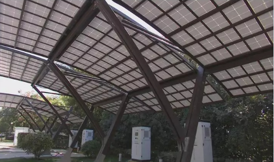 光伏充电车棚,每个车棚2.5KW,充电桩一台30KW。车棚流线型设计,让柔性光伏电池板与曲面车棚完美融合,获得电力的同时呈现最精致的外观。