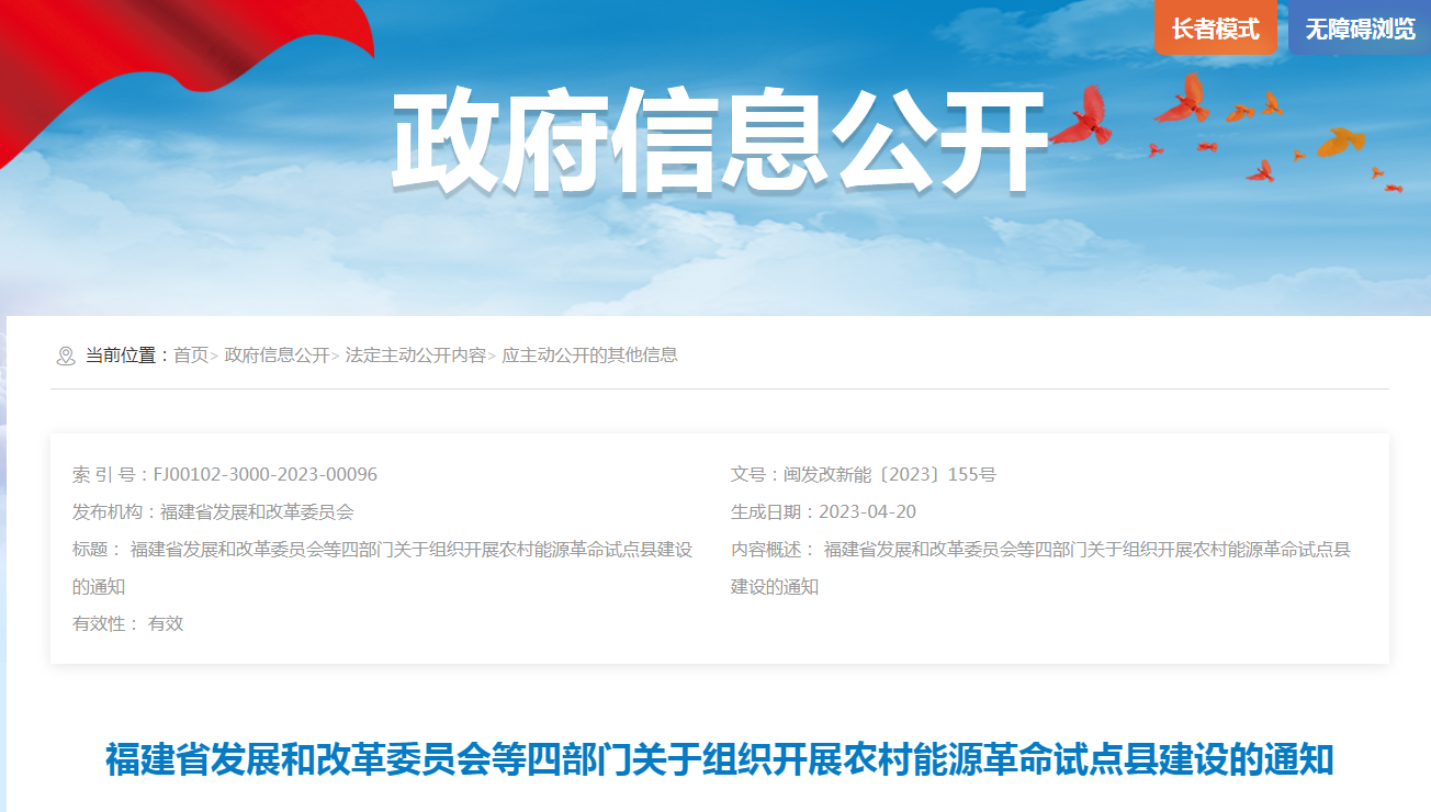 4月21日,福建发改委发布《福建省发展和改革委员会等四部门关于组织开展农村能源革命试点县建设的通知》。