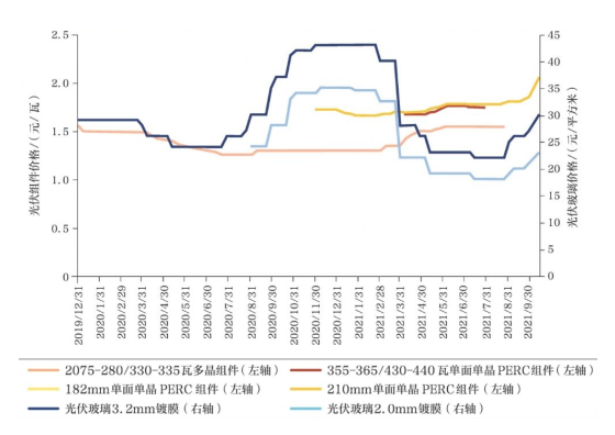 光伏玻璃价格于当年11月中旬达到顶峰,3.2mm镀膜光伏玻璃的报价在41-48元/平方米,平均报价达42元/平方米,2.0mm镀膜光伏玻璃的平均报价也达到了34元/平方米。相较于7月中的24.0元/平方米,价格涨幅超过80%,动荡波及全产业链,一时形成了下游“集体放假”的局面。