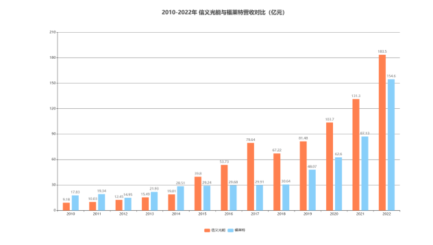 在“双雄”的较量之间,规模也是制胜的法宝。从营收上看,2015年以前,福莱特一直作为光伏玻璃领域的头号玩家,多年领先信义光能。然而就在2015年,信义光能拿下39.8亿元的营收,以同比增长109.36%的超高增速,将仅营收29.24亿元并在此后几年维持个位数增长率的福莱特狠狠甩在身后。其中的一个重要原因在于,信义光能在2013年底成功从母公司分拆,单独上市港股,而福莱特却在同一年被叫停IPO,直到2015年才在港股上市。