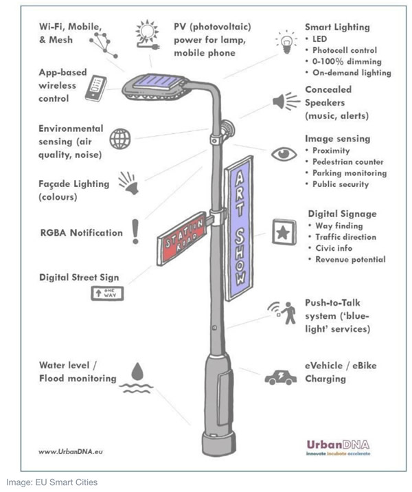 欧盟提出的口号是:“一个不起眼的灯柱可以做的十件事,与照明无关”,计划希望升级1000万个灯柱,使它们成为能够提供一系列智慧城市服务的太阳能智能灯柱。