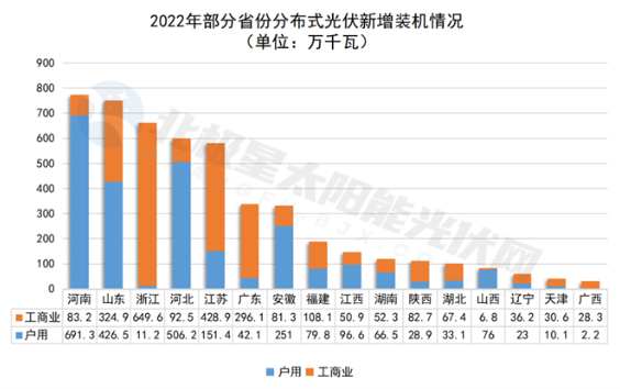 2022年,随着工商业分布式一跃而起,成为装机增长的主要力量之一,原有的分布式装机版图也被打破,分布式光伏重点市场正在由传统的河北、河南、山东等地向浙江、江苏、广东、安徽等东南地区转移。