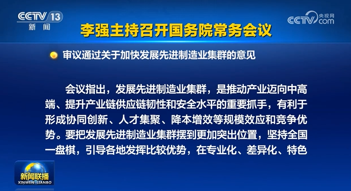 会议指出,发展先进制造业集群,是推动产业迈向中高端、提升产业链供应链韧性和安全水平的重要抓手,有利于形成协同创新、人才集聚、降本增效等规模效应和竞争优势。要把发展先进制造业集群摆到更加突出位置,坚持全国一盘棋,引导各地发挥比较优势,在专业化、差异化、特色化上下功夫,做到有所为、有所不为。要统筹推进传统产业改造升级和新兴产业培育壮大,促进技术创新和转化应用,推动高端化、智能化、绿色化转型,壮大优质企业群体,加快建设现代化产业体系。要坚持有效市场和有为政府更好结合,着力营造产业发展的良好生态。
