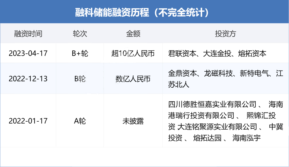 最新一笔大额融资就在今年4月。投资界获悉,大连融科储能集团股份有限公司(简称“融科储能”)完成超10亿元B轮融资,本轮融资由君联资本领投,大连金投、老股东熔拓资本及其他多家投资人跟投。