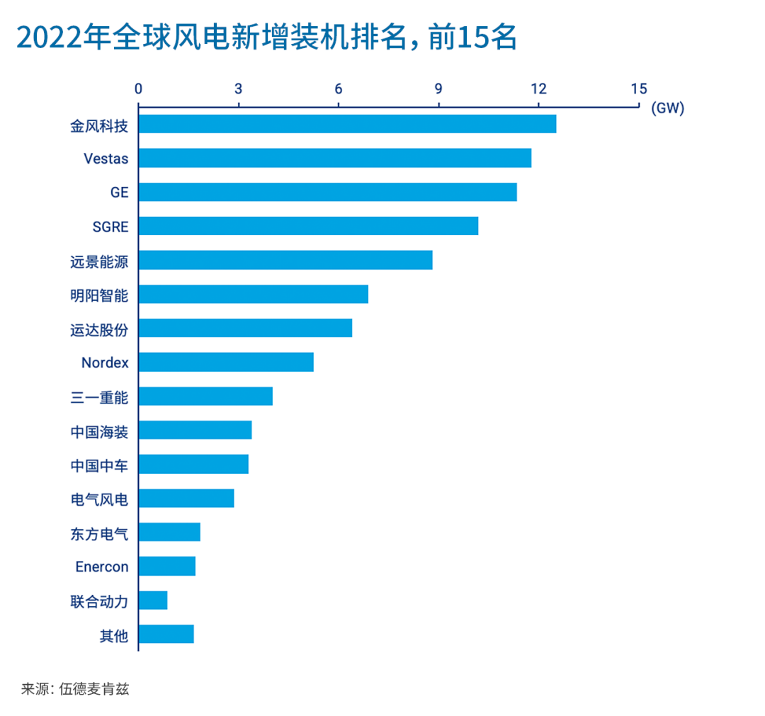 在2022年全球风电新增装机排名前15名榜单中,中国风电整机企业有10家,分别是金风科技、远景能源、明阳智能、运达股份、三一重能、中国海装、中国中车、电气风电、东方电气、联合动力。