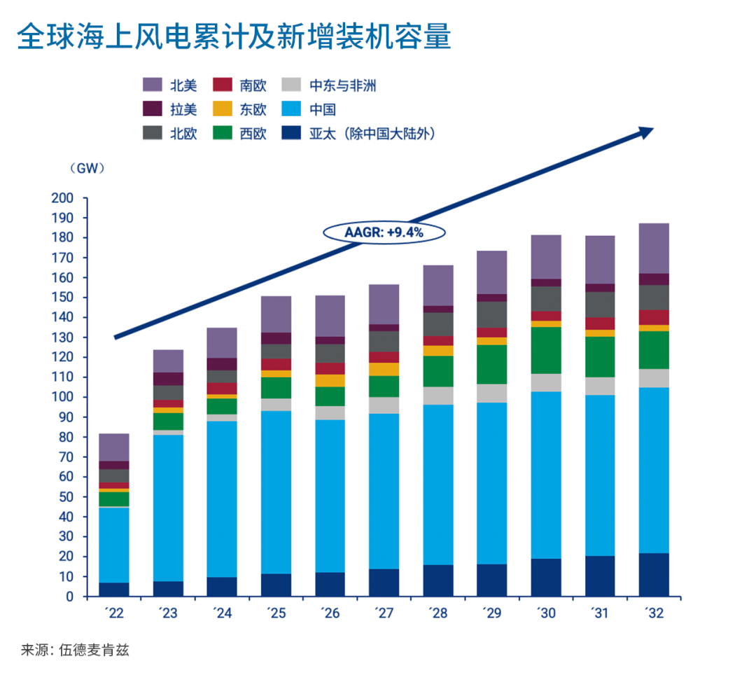 到2032年,全球海上风电累计并网容量将增加七倍,达到460GW,占未来十年新增总容量的26%。