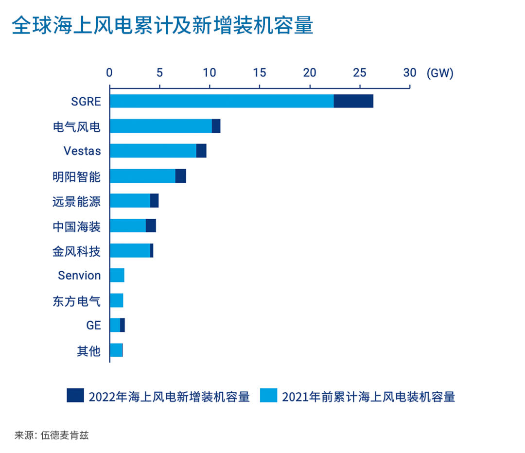 在全球海上风电累计及新增装机容量排名中,中国企业占6席。分别有电气风电、明阳智能、远景能源、中国海装、金风科技、东方电气。