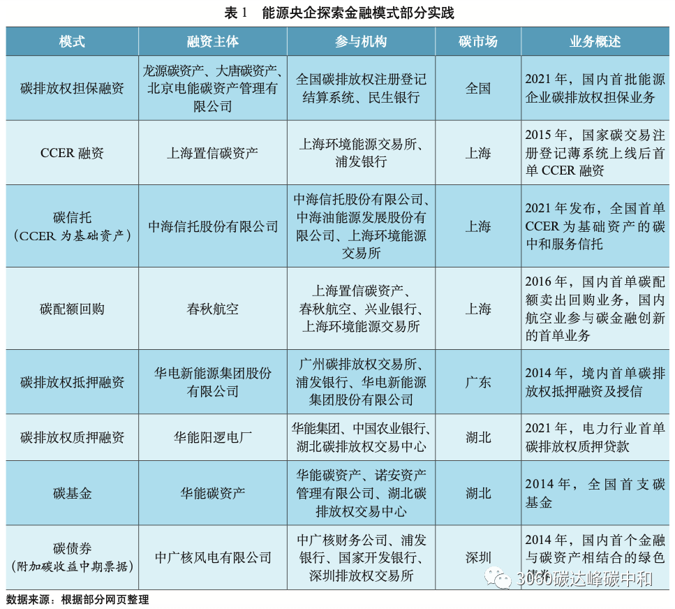 能源央企已探索出多种碳排放权融资模式,除常见的CCER融资外,还包括抵质押融资、担保贷款、碳债券、碳基金、碳信托和碳配额回购等。配合各大银行及地方碳交易所的广泛参与,各央企集团子公司、集 团特设的碳资产公司等积极担任融资主体。表 1 列出了部分能源央企,参与的碳金融创新的多项“首次”实践。