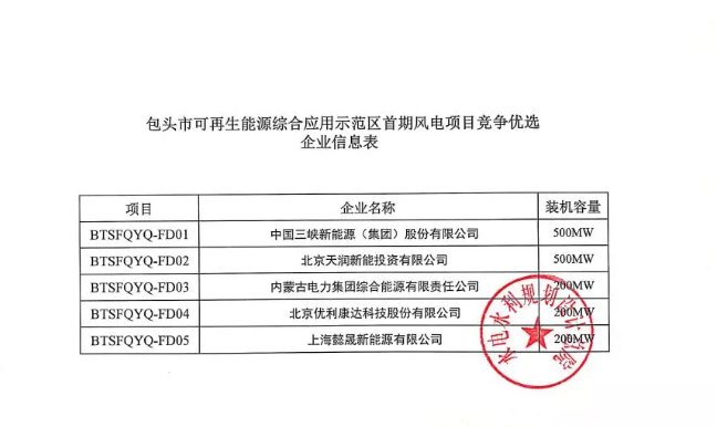 内蒙古包头市可再生能源综合应用示范区首期风电项目竞争优选企业公示