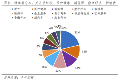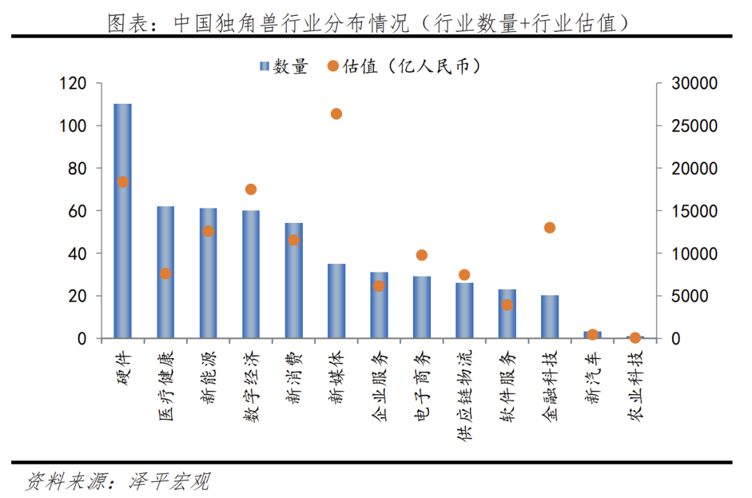 从数量分布来看,硬件、新能源、医疗健康领域独角兽数量位列前三,分别为110家、70家、63家。