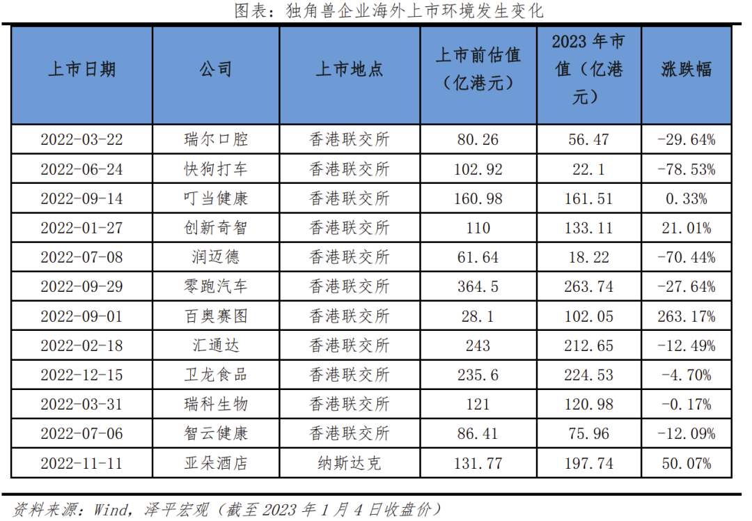 独角兽海外上市有风险。截至2022年12月,瑞尔集团、快狗打车、润迈德、零跑汽车、汇通达、卫龙食品、Atour亚朵酒店等市值涨跌幅为-29%、-78%、-70%、-27%、12%、-4.7%、50%,部分独角兽中概股的表现并不乐观。