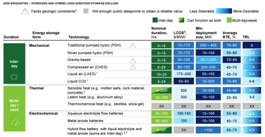 长时储能技术可以根据其物理属性以及各自的能力(如往返效率-RTE和技术就绪水平-TRL)以及是否存在地质条件限制进行分类,这可以为每种技术的最佳应用提供一些指示。