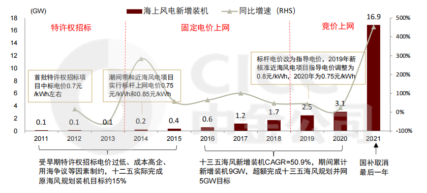 不管是横向对比全球海上风电装机,还是纵观中国海上风电发展历程,2021年都堪称中国海上风电发展拐点之年。