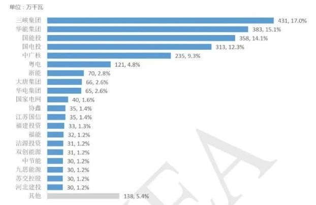 政策指引的变革,深刻影响着市场格局的变动。对海上风电而言,在利好前景吸引下,最显著的现象就是越来越多“玩家”的入局。根据CWEA数据,截至2021年底,中国海上风电开发企业累计装机上,共有20家单位上榜。其中,三峡集团、华能集团、国家能源集团、国家电投、中广核、粤电等开发商累计海上风电装机在1GW以上。