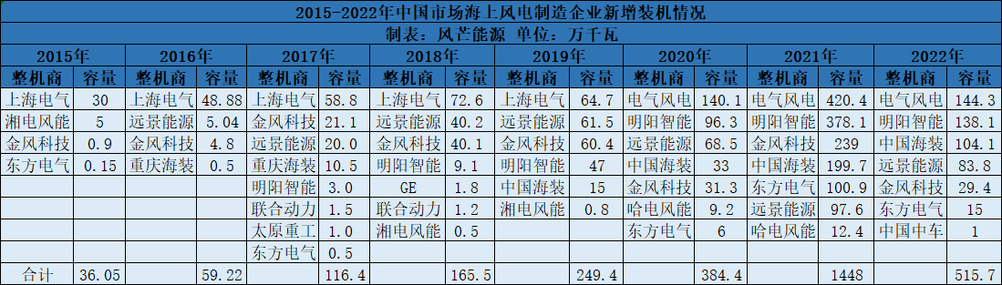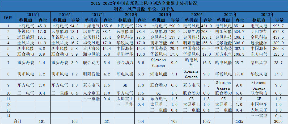 随着市场变化发生剧烈变动的,还有以整机商为代表的风电产业链中上游板块。根据CWEA数据,2015年,中国海上风电市场共有10家整机商,累计装机容量1GW左右。2022年,中国海上风电市场共有14家整机商,累计装机容量超30GW。