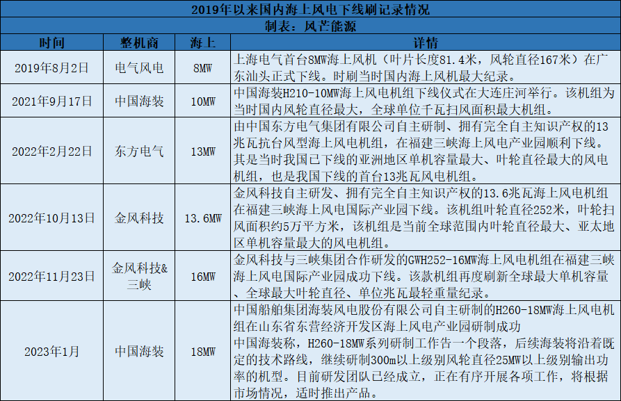 在平低价压力与深远海发展指引下,大兆瓦、漂浮式成为整机商重点押宝对象。为抢夺市场,2021年以来,整机商不断推出新的大兆瓦机型,海上风电风机迭代速度加快。16MW、18MW甚至20MW海上风机正成为海上整机商布局重点。