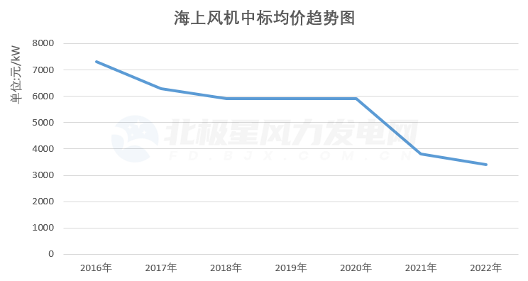 全面平价时代,与海上风电发展高景气度相反的是,我国海上风机价格一路走低,从2019年的8260元高价,跌至2023年含塔筒3200元/kW的低价。