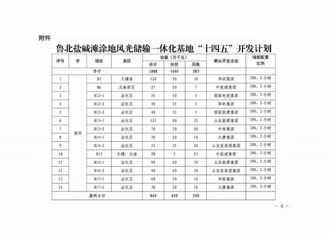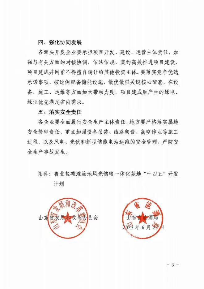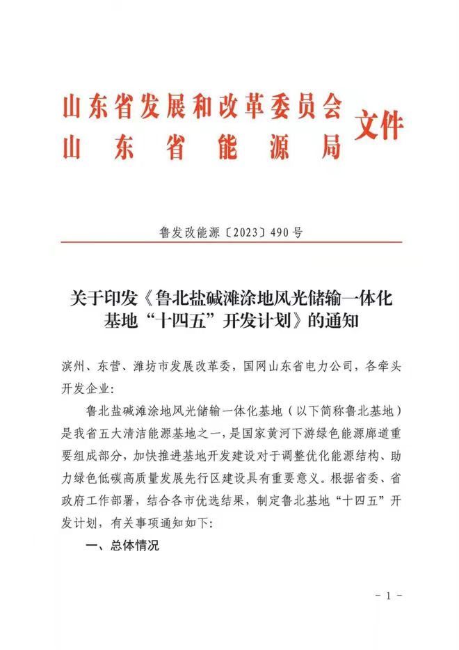 6月27日,山东省发展和改革委员会、山东省能源局印发了关于印发《鲁北盐碱滩涂地风光储输一体化基地“十四五”开发计划》的通知,经竞争优选确定35个项目、1888万千瓦列入鲁北基地“十四五”开发计划。