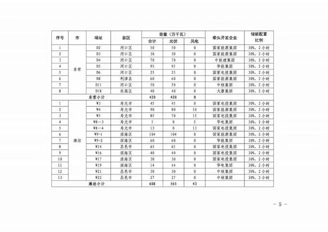其中,滨州市开发项目14个、总规模860万千瓦(光伏发电620万千瓦、风电240万千瓦);东营市开发项目8个、总规模420万千瓦,均为光伏发电;潍坊市开发项目13个、总规模608万千瓦(光伏发电565万千瓦、风电43万千瓦)。上述项目纳入省保障性并网项目名单,原则上2025年底前全部开工、2027年底前建成并网。(储能配置皆为30%、2小时)
