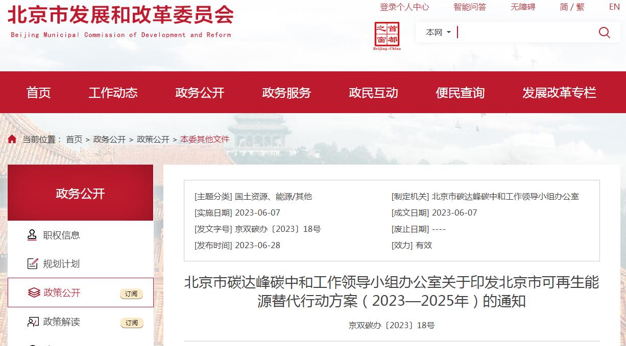 《北京市可再生能源替代行动方案(2023—2025年)》已经北京市碳达峰碳中和工作领导小组审定同意,现印发你们,请认真贯彻落实。
