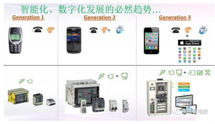 施家的宣传文案是这样的画风(摘录自施耐德宣传PPT),你们自己感受下,他们自己把现在的傻瓜式配电柜,比作能砸核桃的诺基亚: