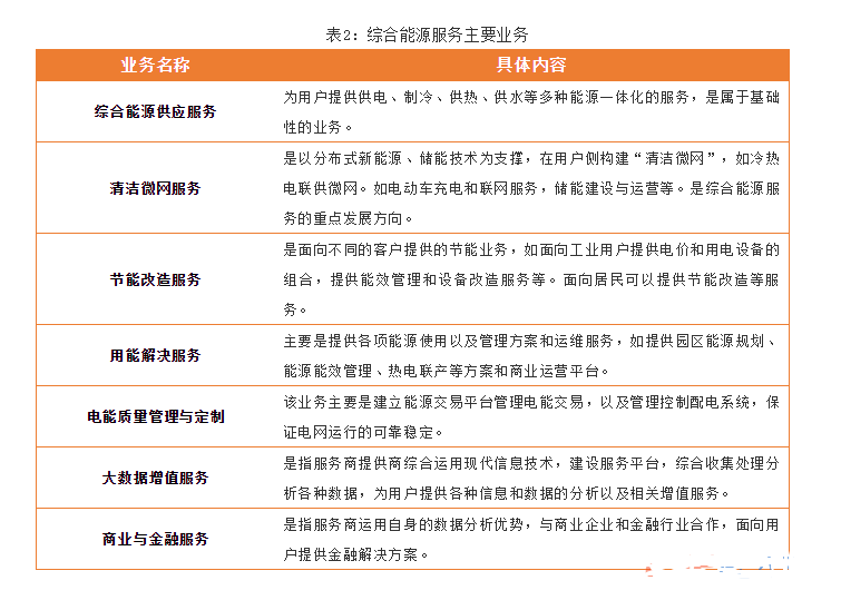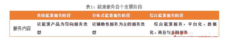 在不同的历史发展阶段均有不同的业务体系。可以分为传统能源服务、分布式能源服务和综合能源服务三个阶段。