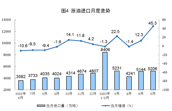 原油生产保持平稳,进口快速增长,原油加工较快增长。上半年,生产原油10505万吨,同比增长2.1%。进口原油28208万吨,同比增长11.7%。加工原油36358万吨,同比增长9.9%。6月份,生产原油1752万吨,同比增长1.9%。加工原油6095万吨,同比增长10.2%。