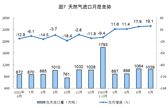 天然气生产平稳增长,进口增速较快。上半年,生产天然气1155亿立方米,同比增长5.4%。进口天然气5663万吨,同比增长5.8%。6月份,生产天然气183亿立方米,同比增长5.5%。