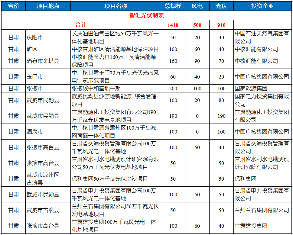 甘肃第三批大基地项目为14.2GW,均为预备项目,均采取就地消纳。各投资企业的规模如下表所示。