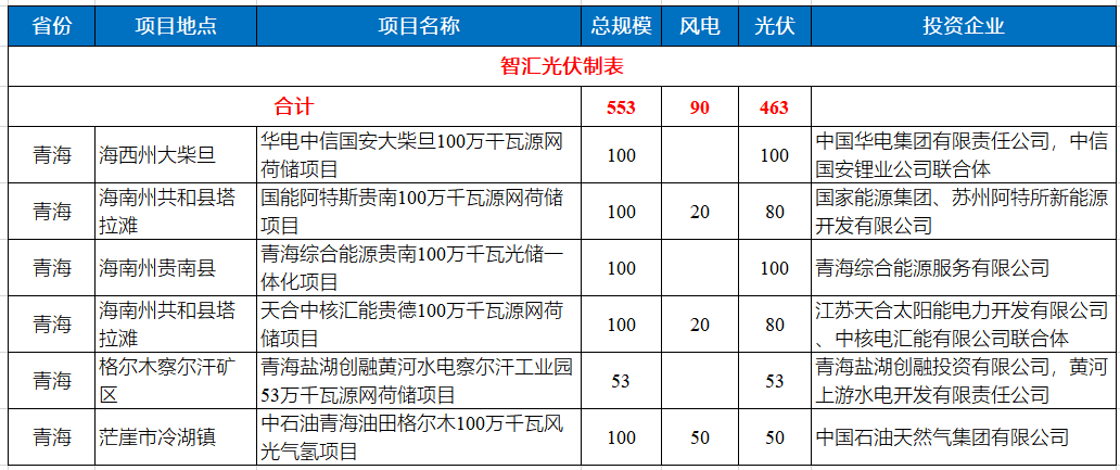 本文统计了青海省入选第三批大基地的部分项目,总规模为5.53GW。主要投资企业包括:华电集团&中信国安、国家能源集团&阿特斯、国家电网、天合&中核集团、盐湖股份&国电投、中石油。