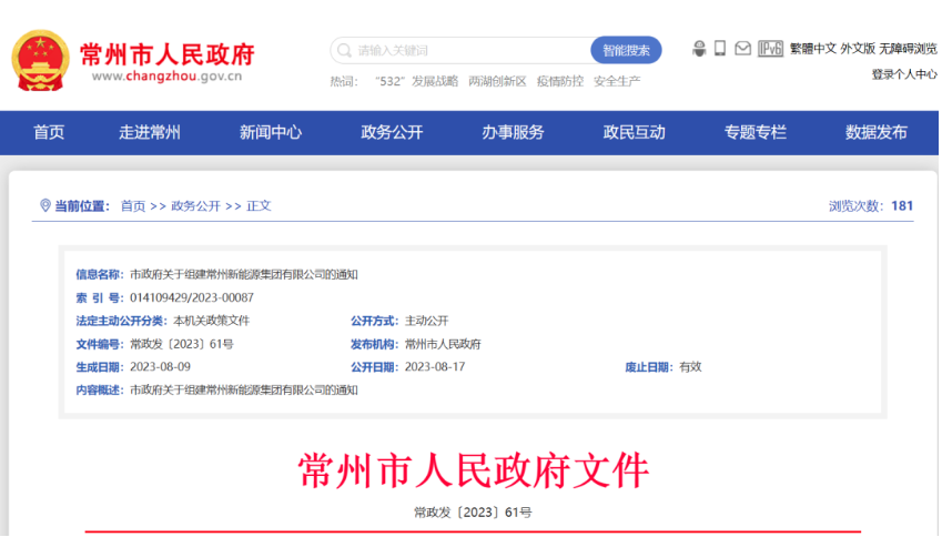8月17日,江苏常州市政府发布组建常州新能源集团有限公司的通知。