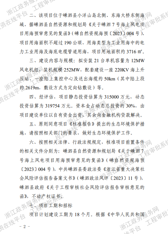 中广核嵊泗7#海上风电项目位于嵊泗县小洋山岛北侧、东海大桥东侧海域,装机规模252MW;