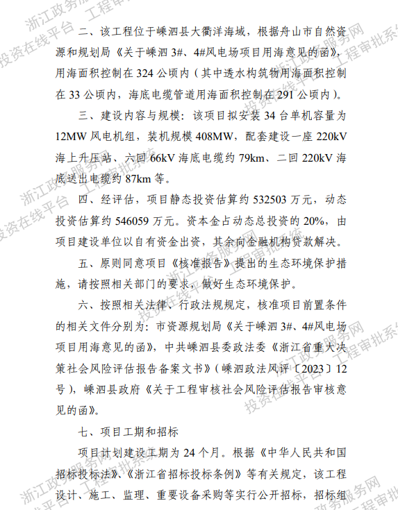 嵊泗3#、4#海上风电场项目位于嵊泗县大衢洋海域,装机规模408MW;