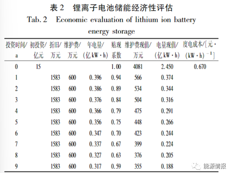 锂离子电池储能电站的经济性评估(表2),按100MW项目初始投资成本1.5元/(W・h),年运维成本0.06元/W,寿命为9a,残值为5%,每年运行次数500次,放电深度90%,储能循环效率88%,寿命终止容量75%等条件,对锂离子电池储能电站进行财务经济性评价建模,测算储能度电成本约为0.67元/(kW・h)。
