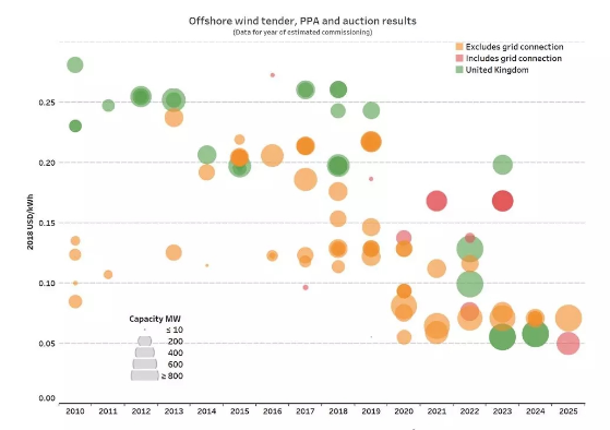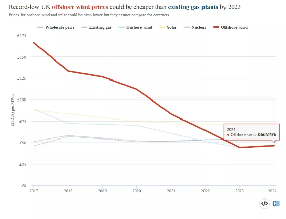 2019年9月20日,英国6个海上风电场(总计5.5GW)竞标结果揭晓,报出创纪录的低价:2023/24年开始运营的项目的价格为39.65英镑/兆瓦时(按2012年价格,按通货膨胀调整后为44英镑/兆瓦时),而2024/25年的项目为41.61英镑/兆瓦时。这些价格比政府的“参考价格”低8-9英镑/兆瓦时,意味着这些新的海上风电场还将比现有的燃气发电站更便宜地发电。预计这些海上风电项目每年将生产约290亿千瓦时(29TWh)的电力,相当于英国2018年总发电量的9%,足以为英国2600万户家庭中的四分之一供电。按照英国的电力市场机制和市场趋势,这些风电项目不但会收取任何补贴,反而会在2017年前向消费者回馈近6亿英镑。